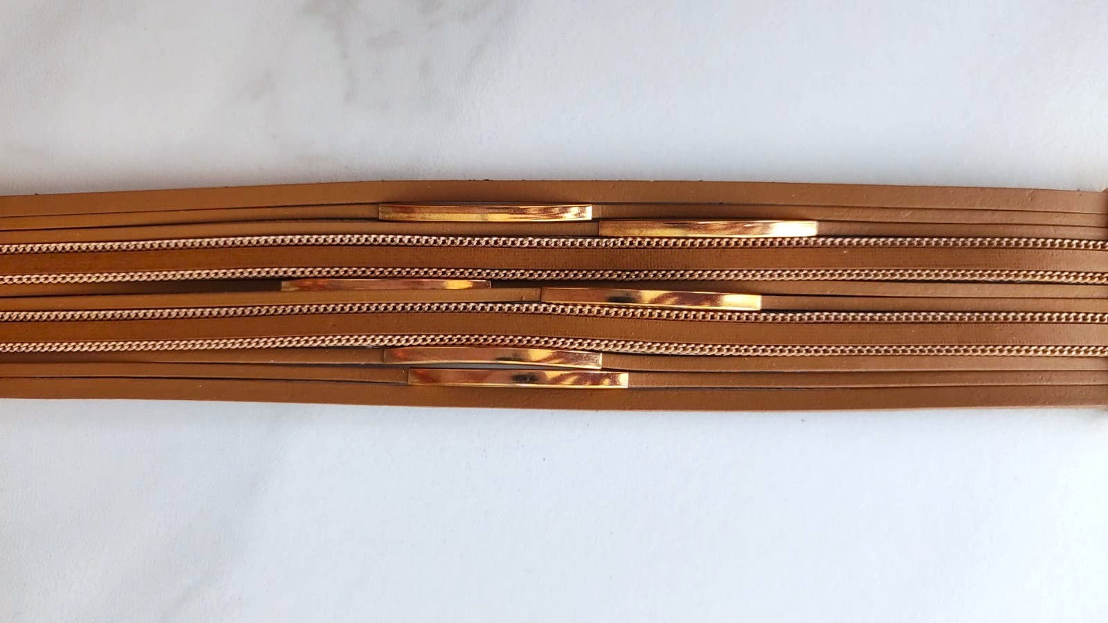 Pulsera Ancha Multi-Hilos en Tono Caramelo con Barras y Cadenas en Oro Rosa
