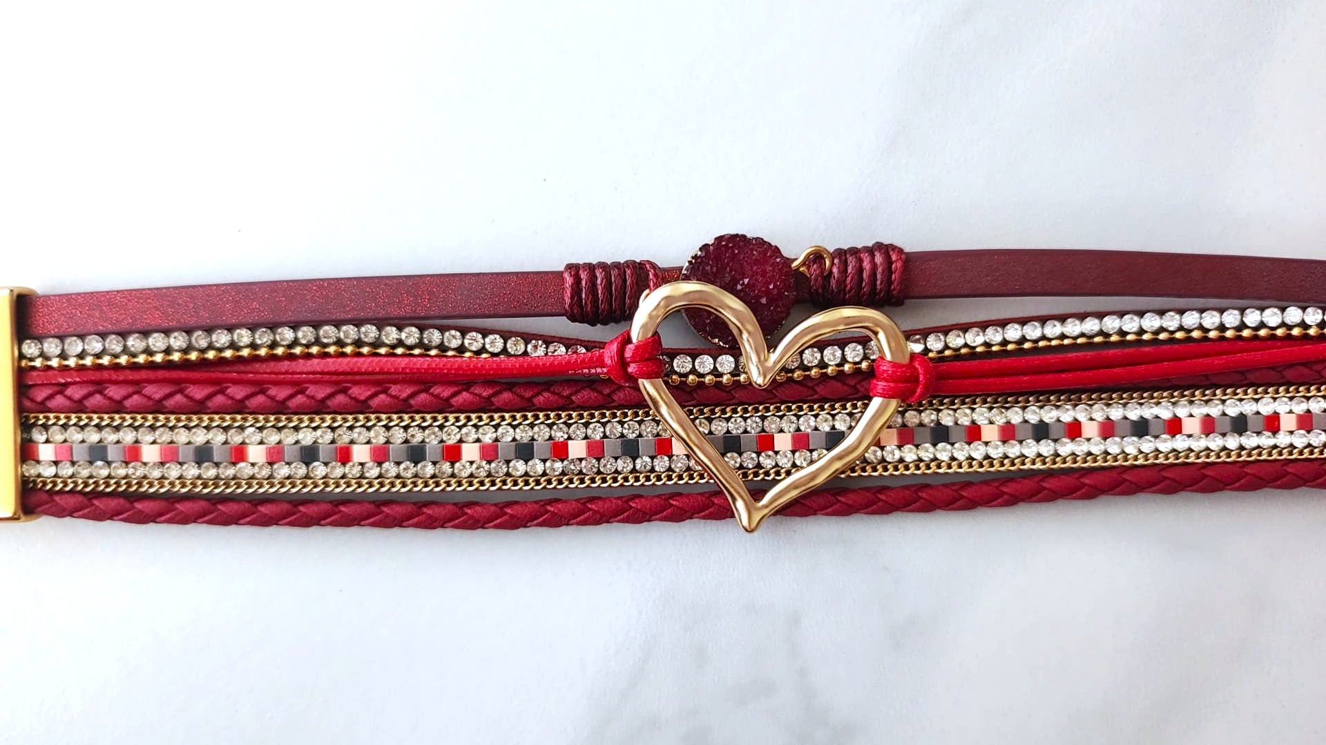 Pulsera Multi-Hilos en Tono Rojo Vino con Corazón Dorado y Cristales de Strass